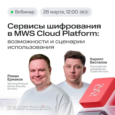🔹🔹🔹🔹26 марта в 12:00 (мск) пройдет бесплатный вебинар «Сервисы шифрования в MWS Cloud Platform: возможности и сценарии использования». Разработчики сервисов расскажут: ⚫️как сервисы шифрования