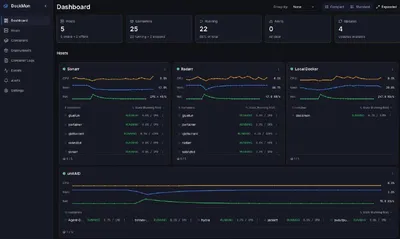 🖥 Современная панель для мониторинга Docker-контейнеров в реальном времени Что умеет: - следит за локальными и удалёнными Docker-хостами в одном окне - умно перезапускает контейнеры с настраиваемо