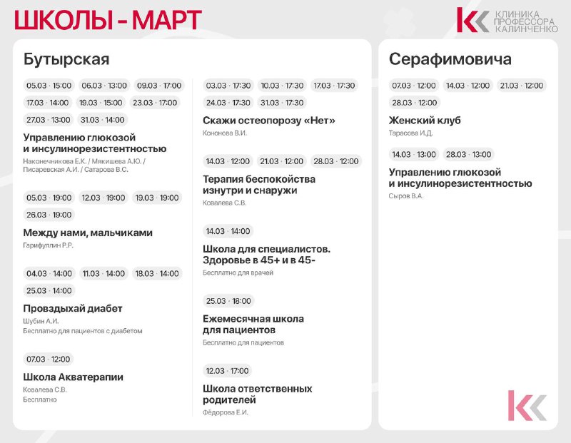 🐚🐚🐚🐚🐚 🐚🐚🐚🐚🐚 Ежемесячно в Клинике профессора Калинченко проходят Школы для пациентов. С актуальным расписанием на месяц можно ознакомиться в этом посте 👆 Школа — это обучающая встреча, н