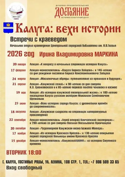 ✨Встречи с краеведом "Калуга: вехи истории" в ДПИКЦ "Достояние". Организаторы приглашают вас на краеведческие встречи с заведующей отделом краеведения ЦГБ им. Гоголя Маркиной И.В. Бесплатно. 📍Ад