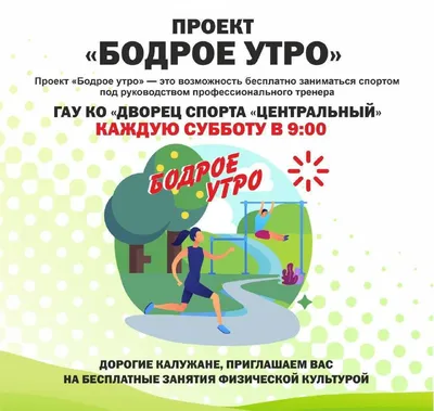 ✨Проект «Бодрое утро» во Дворце спорта «Центральный». Каждую субботу до 31 мая жители Калуги смогут бесплатно позаниматься общей физической подготовкой под руководством профессионального тренера —