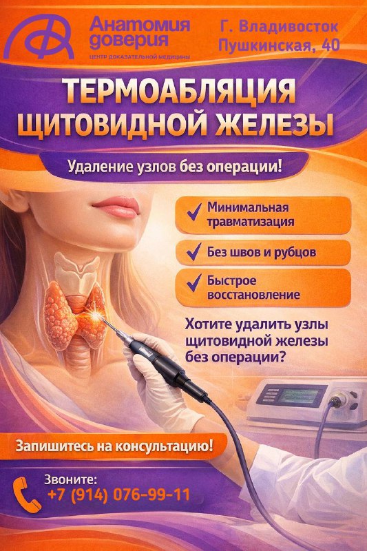 Центр доказательной медицины «Анатомия доверия» предлагает безоперационный метод удаления узлов щитовидной железы - микроволновая термоабляция Это малоинвазивная процедура под контролем УЗИ: тонкий з