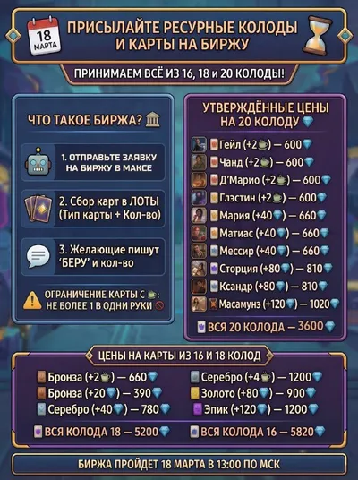 ⚜️⚜️⚜️⚜️⚜️⚜️⚜️ ⚜️⚜️⚜️⚜️⚜️⚜️⚜️⚜️ 🥳Долгожданная биржа ⚜️ назначена на 18 марта в 13:00 по мск!!! ⚜️Как подать карту на биржу 👉 тут 👈 ⚜️Что такое биржа? — Мы собираем одинаковые карты в лоты, пи