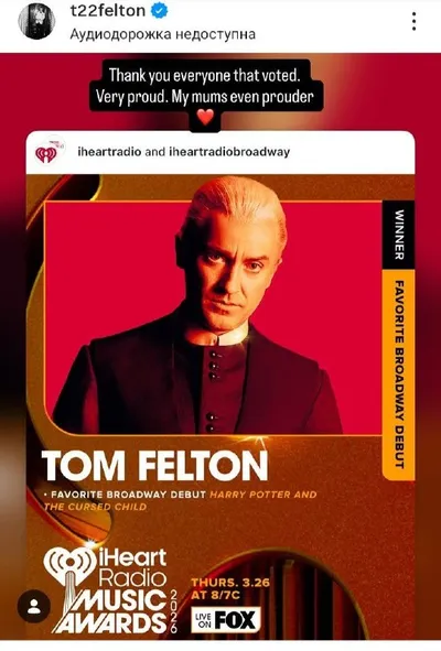 🔥 💋🥹👩⚕️🥹🤨😡😛 Благодарю вас за то что проголосовали за меня. Очень тронут. Моя мама очень гордится ❤️ Том Фелтон получил награду в номинации «Любимый бродвейский дебют» за роль Драко Малфоя в