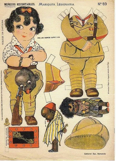 Игрушки испанских детей 100-летней давности. Бумажная кукла Mariquita Legionaria - девочка-солдат, гордо держащая в руке истекающую кровью голову африканского ребенка. С помощью таких изделий поддерж