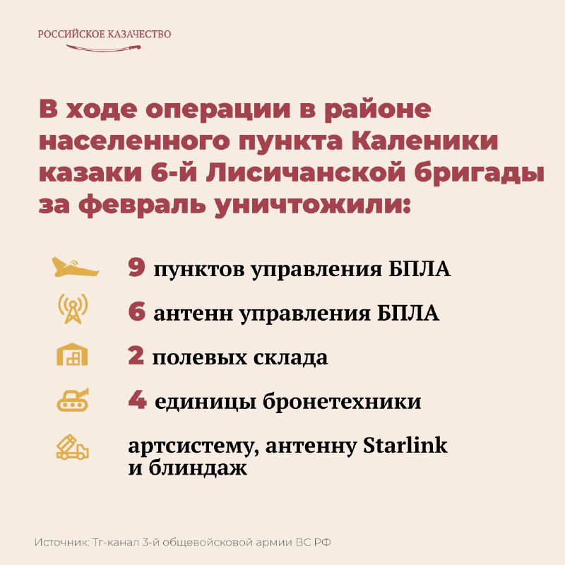 💂♂️ В зоне СВО в районе населенного пункта Каленики ДНР активное участие в боевых действиях принимает 6-я отдельная гвардейская мотострелковая Лисичанская казачья бригада имени М.И.Платова. О достиж