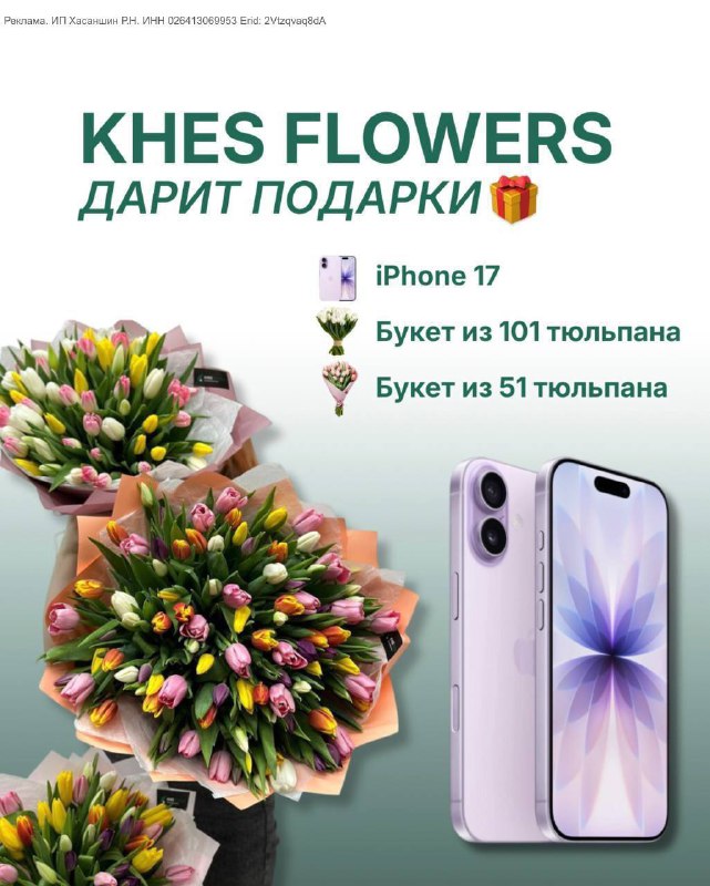 ДАРИМ 🅰️🅰️🅰️🅰️🅰️ Розыгрыш к 8 марта! Будет 3 победителя: 1️⃣ iPHONE 17 2️⃣ БУКЕТ ИЗ 101 ТЮЛЬПАНА 3️⃣ БУКЕТ ИЗ 51 ТЮЛЬПАНА Условия максимально простые: 1. Подпишитесь на KHES FLOWERS и Казань