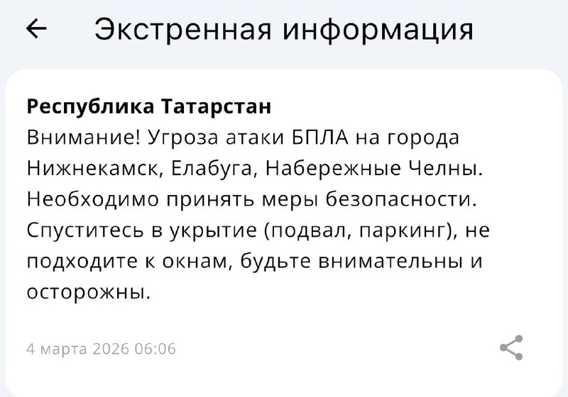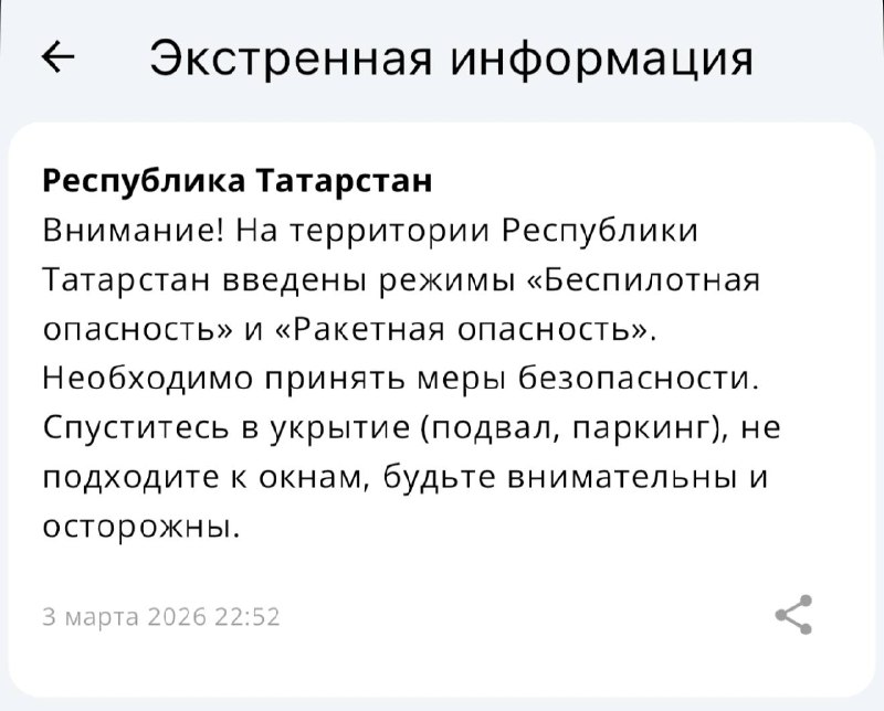 ❗️ В Татарстане объявлены режимы «Ракетная опасность» и «Беспилотная опасность» Необходимо принять меры безопасности. Спуститесь в укрытие (подвал, паркинг) и не подходите к окнам, сообщает МЧС 👓 К