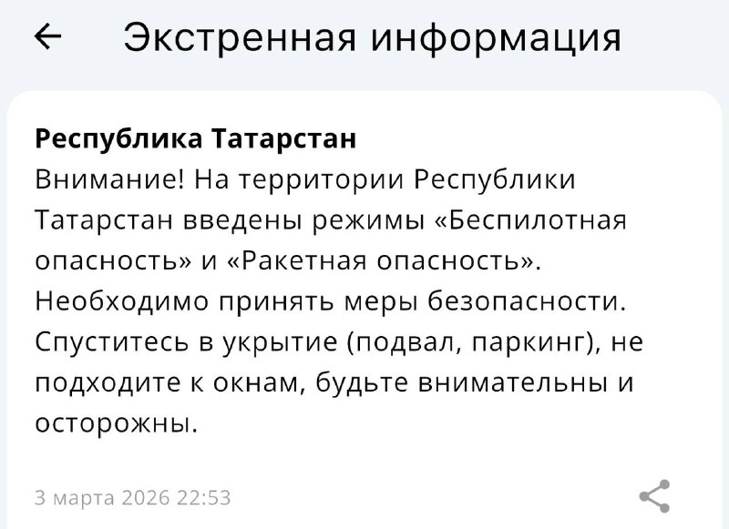 ❗️В Татарстане объявлены режимы «Беспилотная опасность» и «Ракетная опасность» Они был объявлен сегодня в 22:53. В некоторых районах города звучат сирены. МЧС призывает спуститься в укрытие (подвал