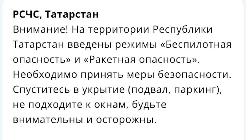 На территории Республики Татарстан введены режимы «Беспилотная опасность» и «Ракетная опасность». 🔴Подписаться ✉️ Написать нам