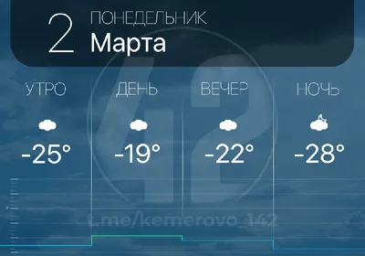 Доброе утро, Кемерово🌷 Погода на сегодня 📅 Сегодня ожидается −18°..−20°, пасмурно, без осадков. Ночью −27°..−29°. Ветер южный 4 м/с.