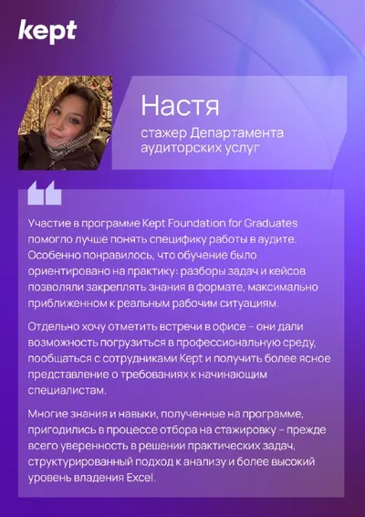 Под конец недели рассказываем об актуальных вакансиях Kept в Беларуси⚡️ 🟣Ассистент аудитора, отдел банковского аудита 🟣Секретарь, административный персонал 🟣Менеджер по МСФО, сектор по оказанию на