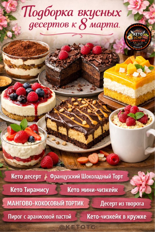 Подборка вкусных 💔💔💔💔💔💔💔💔 к 8 марта🌹 Кето десерт Французский Шоколадный Торт Кето Тирамису Кето мини-чизкейк МАНГОВО-КОКОСОВЫЙ ТОРТИК Десерт из творога Пирог с арахисовой пастой Кето-чизкейк
