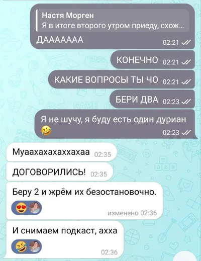 А кто-то знает, что добавляют в дурианы, почему на них так подсаживаешься? 😅 Настя вот сказала, что привезёт - всё, сон как рукой сняло, хожу из угла в угол, предвкушаю, считаю часы до нашей встречи