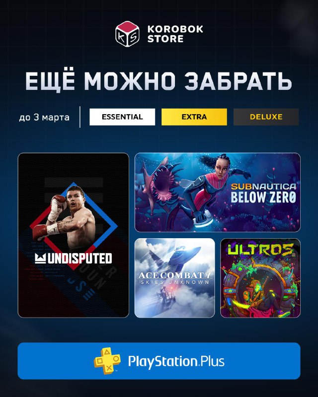 🛒 Дружеское напоминание: сегодня последний день, чтобы забрать февральскую подборку PS Plus. • Undisputed (RU-текст) • Subnautica: Below Zero (RU-текст) • Ace Combat 7 (RU-текст) • Ultros (Без перев