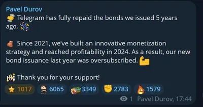 📰 Павел Дуров поделился новостями: Telegram полностью закрыл долг по облигациям, выпущенным пять лет назад 📈 С 2021 года команда начала строить собственную модель монетизации — и к 2024 сервис стал
