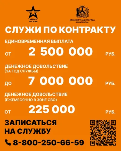 🇷🇺Служба по контракту – это возможность стать частью великой истории своей страны! Размер единовременной выплаты от 2 500 000 руб. Денежное довольствие ежемесячно составляет от 225 000 руб. 💪При