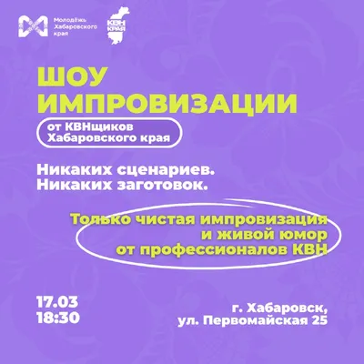 Шоу импровизации от КВН Хабаровского края ❗️ Никаких сценариев и заготовок — только живая импровизация и юмор, который рождается прямо на сцене. Здесь и сейчас. Команды КВН покажут, как шутки появля