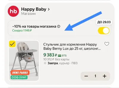 На Яндекса Маркете много товаров со скидкой при оплате картой ВТБ и при добавлении продавца в избранное. Примеры цен: 🔘Стул Happy Baby 9383р Набор говорящих книг BertToys: 🔘Животные 2546р 🔘Цвет