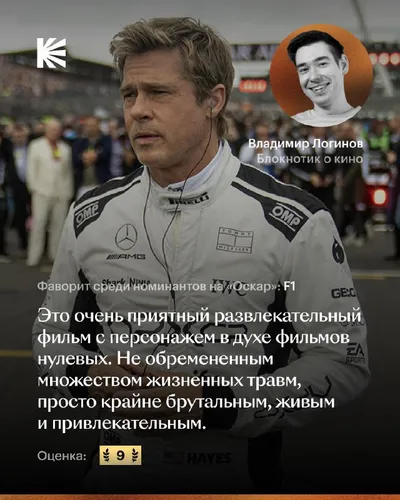 Ребята из Кинопоиска попросили написать пару слов про F1, а я и рад, потому что это один из самых кайфовых (и безшансовых на победу) номинантов на Оскар в этом году! 🏆 https://www.kinopoisk.ru/media