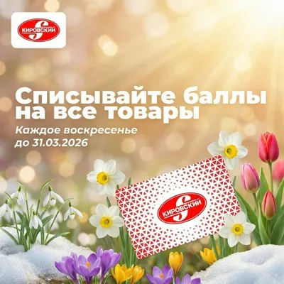Максимум выгоды с картой лояльности «Кировский»! 🤩 Каждое воскресенье до 31.03.2026 используйте свою карту лояльности на полную! Оплачивайте баллами до 30% от суммы чека на любые товары в нашем мага