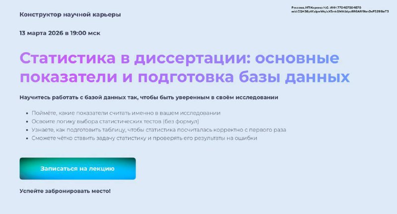 Остались последние 4 места на лекцию по статистике Кто давно собирался разобраться с цифрами в диссертации — сейчас самый подходящий момент. 20 марта в 19:00 мск встречаемся с Марией Владимировной В