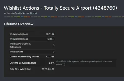 Totally Secure Airport - 300 000 вишлистов за месяц с анонса. Игра продолжает набирать вишлисты. Посещения капают из тиктоков, плюс сам Стим льет траффик на игру. Totally Secure Airport - прекрасный
