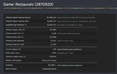 Restaurats - 2млн$ гросс продаж за 4 месяца. Релиз игры был 7 ноября. Вот, накапало. Впереди будет дейли дил и бесплатные выходные. Очень интересно, какие будут результаты. Скоро выходит апдейт дл