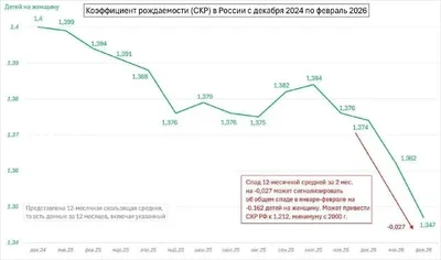 ⚡️Рождаемость в России упала до уровня 26-летней давности По итогам 2026 года коэффициент рождаемости может составить всего 1,212 ребенка на одну женщину. Это антирекорд с 1999 года. Чтобы население