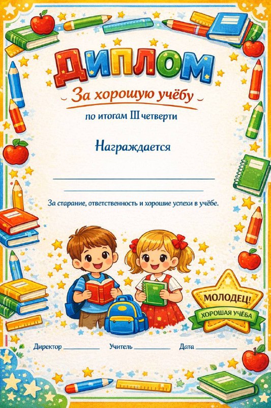 Дипломы на окончание 3 четверти 🔔 ☄️Наш канал в МАХ👈 Присоединяйтесь!💡 Сказать "СПАСИБО" можно оставив реакцию👍❤️🔥