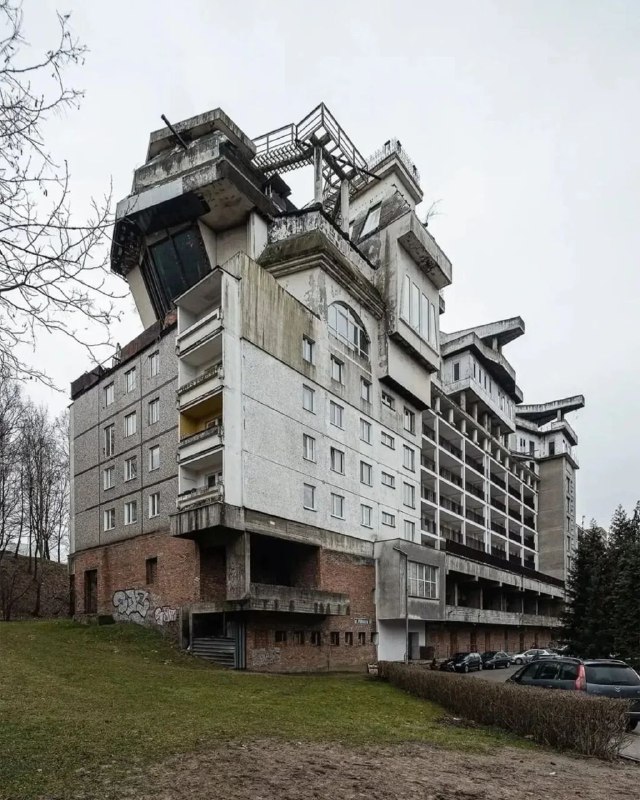 При первом взгляде на это здание создаётся впечатление, что это генерация искусственного интеллекта. Но нет. Стоит оно в польском городке Ястшембе-Здруй. Пишут, что сам дом построили в 1980-е, а вот