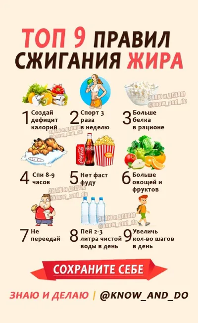 👍 ТОП 9 правил сжигания жира Очень важно их придерживаться, для тех кто сидит на диете и у кого цель похудение Сохраните эту памятку себе, и покажите его своим родным и близким! 🎯 Знаю и Делаю |