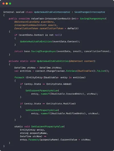Вот хороший пример использования перехватчиков (interceptors) в EF: отслеживание того, когда ваши сущности были созданы или изменены. Вы можете использовать ChangeTracker, чтобы проверить состояние с