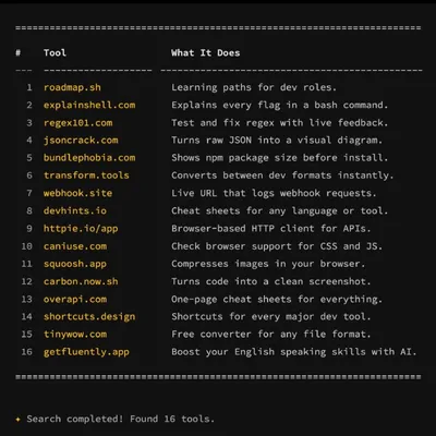 16 полезных сайтов, которые сделают тебя лучшим разработчиком: 1. roadmap.sh — дорожные карты для изучения dev-ролей 2. explainshell.com — объясняет каждый флаг в bash-командах 3. regex101.com — тест