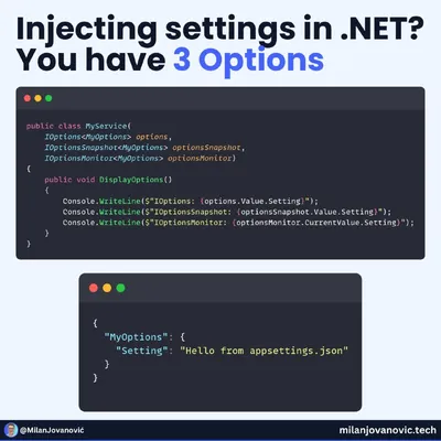 Инжект настроек в .NET У тебя есть 3 основных интерфейса на выбор. Но если выбрать не тот — приложение может просто игнорировать изменения конфигурации. Вот простое объяснение: 1️⃣ IOptions • Считы