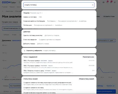 Умный поиск в кабинете В кабинете продавца появился поиск сразу по интерфейсу, чатам с поддержкой и базе знаний, а также вы можете задать вопрос встроенной нейросети. Строка поиска находится в верхн