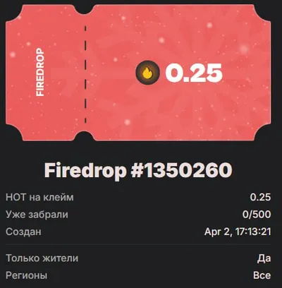 firedrop HOT №236 (не считая ручных) на 500 акк по 0.25 монеты https://app.hot-labs.org/link?claim-9acac4601b firedrop HOT №237 на 500 акк по 0.25 монеты https://app.hot-labs.org/link?claim-80c30c7a58