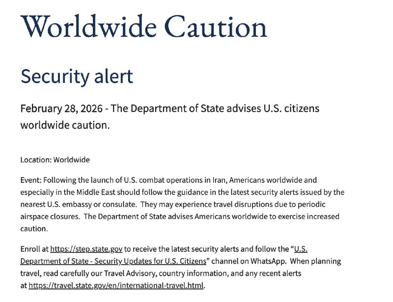 Госдеп США призывает американцев по всему миру быть осторожными «После начала боевых действий в Иране американцы по всему миру, а особенно на Ближнем Востоке, должны следовать указаниям, приведённым