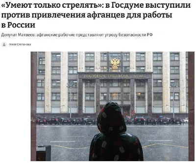 👋 «Умеют только стрелять»: в Госдуме выступили против привлечения афганцев для работы в России Это «большая ошибка» и угроза безопасности государству — депутат Госдумы Михаил Матвеев. Он отметил, ч