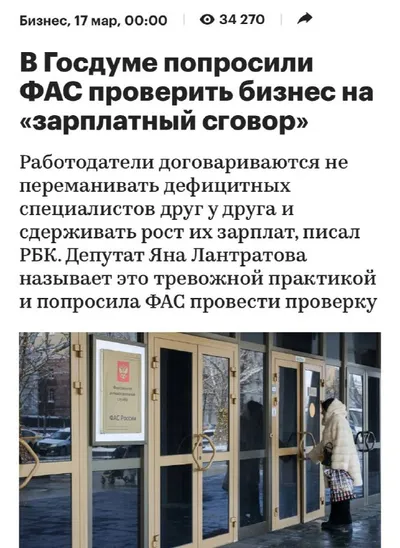 Депутат Госдумы Яна Лантратова попросила ФАС проверить компании в России на «зарплатный сговор», пишет РБК. Она считает, что нельзя допустить, чтобы вместо честной борьбы за хорошего специалиста комп