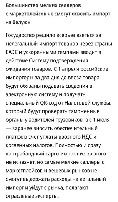 С 1 апреля 2026 года в России начинает работать система СПОТ, которая усложнит карго-доставку товаров из стран ЕАЭС для мелких продавцов на маркетплейсах, сообщает «Коммерсантъ». Импортёры будут обяз