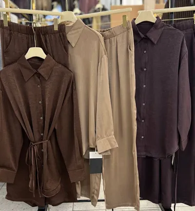 🍎🍎🍎🍎🍎🍎🌷 Брючный костюм из мокрого шелка с эффектом жатки 🎨 ▫️ Артикул: 01404 (6002) ▫️ Рубашка: длина 75 см, ПОГ: 59 см ️▫️Брюки: Длина 105 см , ПОБ 57 см ▫️Цвет: Баклажан, кофе, шоколад. ▫️
