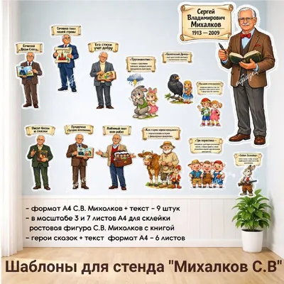 💥Новинка по вашим просьбам 280 р за весь комплект Шаблоны для стенда "Михалков С.В." Материалы для оформления РППС Сергей Владимирович Михалков (1913–2009) — детский писатель, поэт, драматург,