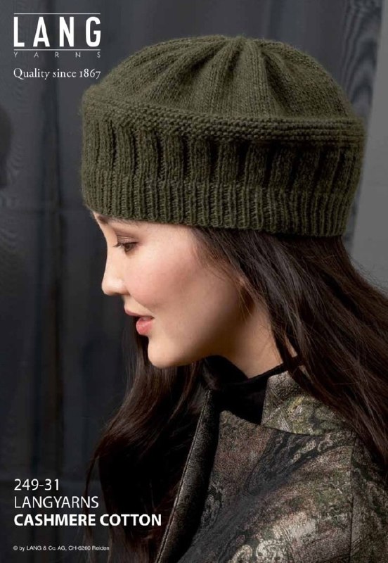 Женская шапка спицами 249-31 Пряжа Lang Кашемир Хлопок (25 гр/85 метров) Расход : 50 г = 2 мотка оливкового цвета 971.0098. Спицы ADDI, размер 2,5 мм, 3 мм и 3,5 мм. Узор І: Спицы 2,5 мм: 1 лиц. п., 1