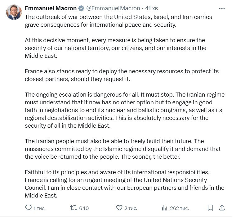 Вместо Путина СБ ООН по Ирану созывает Макрон. Путин заинтересован в долгой войне США с Ираном. Макрон заинтересован выгодно расторговать позицию Франции и ЕС, особенно – в плоскости отношений США