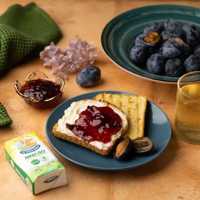 Весеннее утро должно начинаться вкусно! Приготовьте простой, но аппетитный завтрак — тосты со сливочным маслом «Коровка из Кореновки» и сливовым джемом. Натуральное масло сделает блюдо питательным