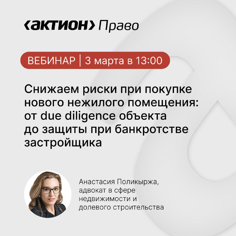 Спешим с анонсом вебинара на тему «Снижаем риски при покупке нового нежилого помещения: от due diligence объекта до защиты при банкротстве застройщика» 📅 Когда: 3 марта в 13:00. Участие бесплатное,