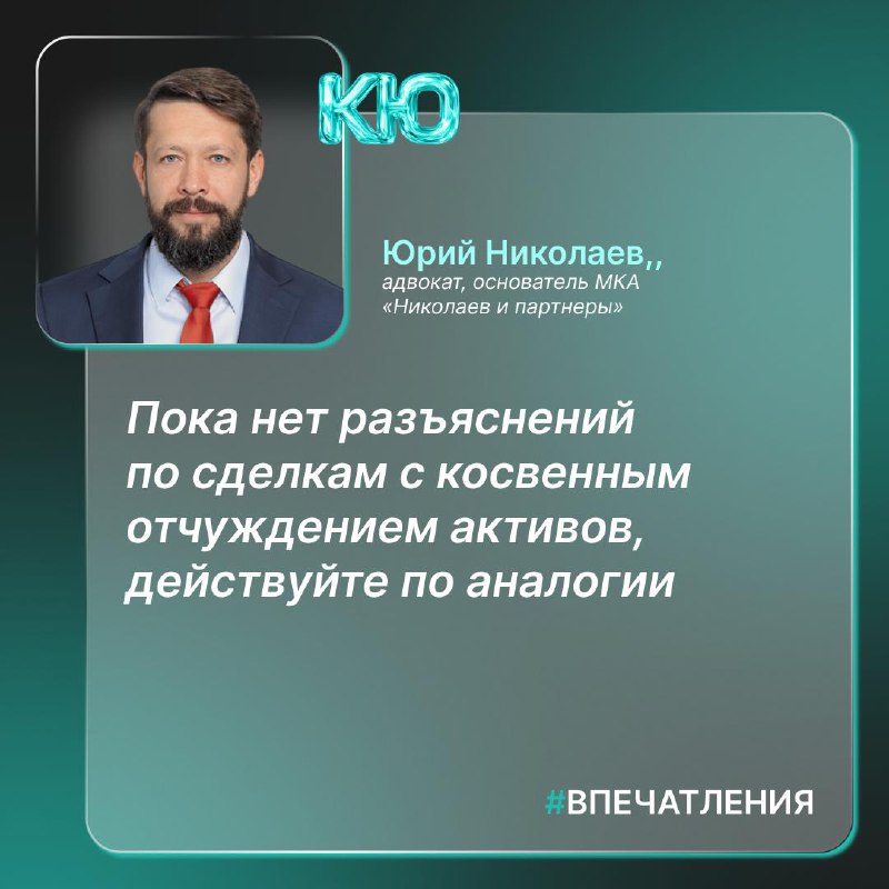 «Пока нет разъяснений по сделкам с косвенным отчуждением активов, действуйте по аналогии» ➡️ Согласование прямых сделок с акциями российских компаний стало понятной процедурой. Однако остаются неясны
