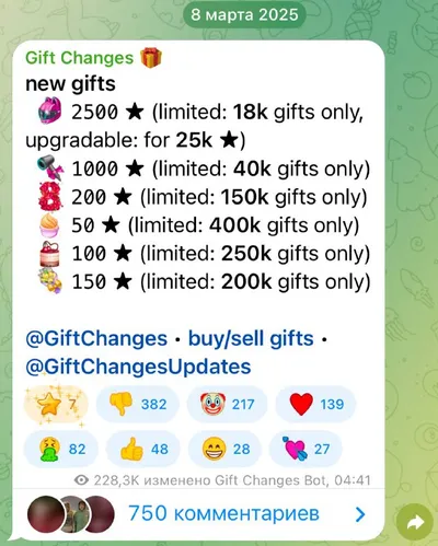 ПОДАРКИ НА 8 МАРТА!?🎁 В прошлом году к Международному женскому дню выпустили сразу 6 новых подарков: 🎁 2 500 ⭐ 🎁 1 000 ⭐ 🎁 200 ⭐ 🎁 150 ⭐ 🎁 100 ⭐ 🎁 150 ⭐