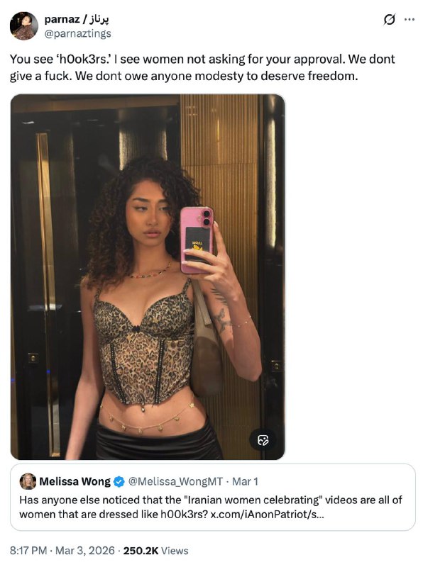 Иранки публикуют фото в открытых нарядах после твита о том, что оппозиционерки «выглядят как проститутки» Пользовательница X (бывшего твиттер) Мелисса Вонг раскритиковала иранских девушек. По ее слов